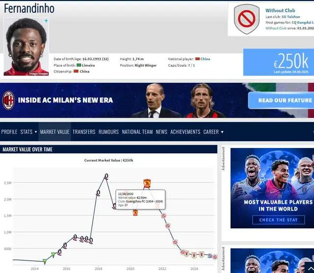 第二个,他的价值也跌到谷底。曾经在中国风头正盛时,费南多身价一度达到270万欧,如今根据德转数据,他只值25万欧,缩水超九成。如果再继续“失业”,恐怕很快就会被彻底遗忘。要知道,他在国足出场7次,还留下过1粒进球,但短短几年,竟然走到如此地步,确实让人唏嘘。