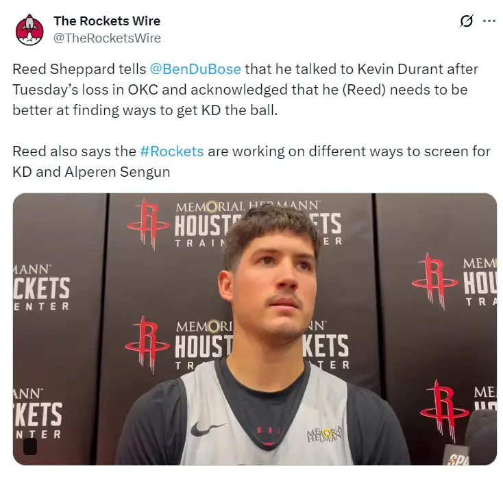 谢泼德在赛前的采访中谈到,自己应该想到更多办法将球传给杜兰特,火箭队也在研究不同的方法为杜兰特、申京进行掩护。