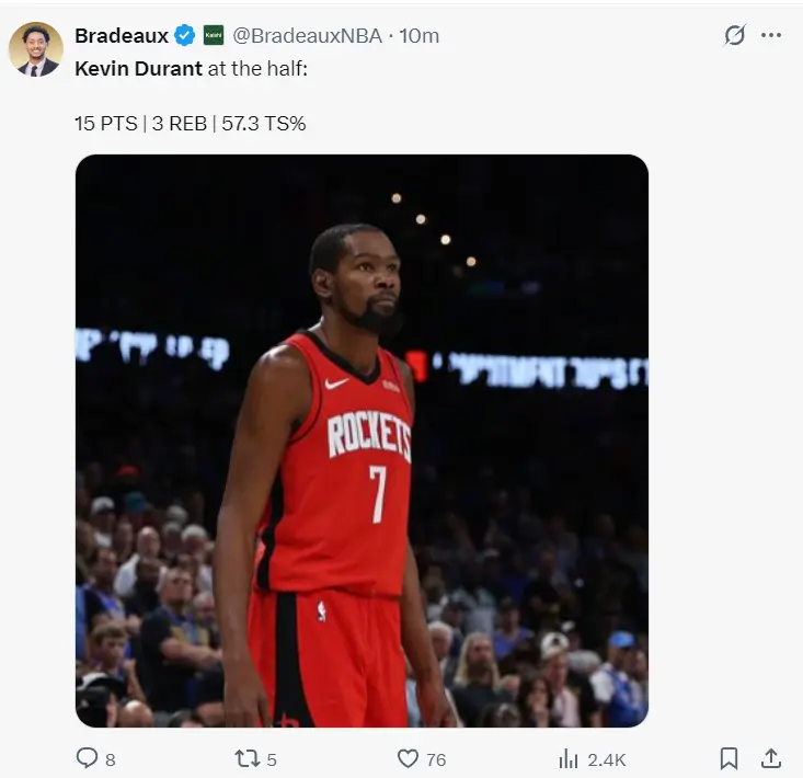 杜兰特此役的上半场也是火箭唯一上双的,17分钟,10中4,三分1中1,罚球7中6拿到15分3篮板1抢断1盖帽0失误,当KD有体能时他就是如此不可阻挡。