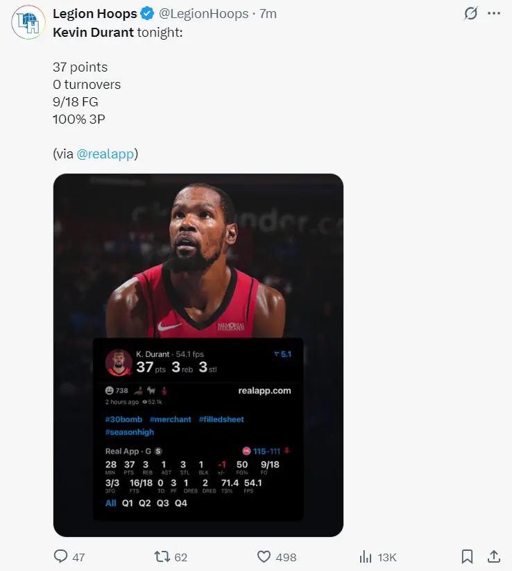 全场比赛,杜兰特28分钟,18中9,三分3中3,罚球18中16,拿到37分3篮板1助攻3抢断1盖帽0失误,命中率50%,三分命中率100%,真实命中率71.4%,正负值-1,这样的表现都输球了。