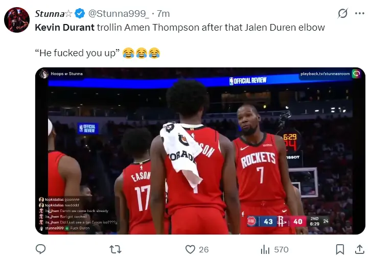 这场比赛最有趣的一幕,在杜伦肘击阿门后,杜兰特朝着阿门喷了一句垃圾话:他把你给毁掉了!哈哈哈哈,随后裁判吹罚了杜伦二级恶意犯规直接驱逐出场,KD真是狠起来自己人都喷。