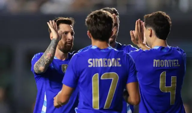 随后比赛变成了阿根廷队的独唱,阿根廷队就像巅峰时期的西班牙队或者巴萨,不断利用三名技术型中场与梅西一起打短传配合,但最终发起致命进攻的往往是边路的插上,比如第14分钟,右后卫蒙铁尔插上传中,梅西打门击中横梁,尼科左肋凌空抽射,麦考利斯特头球得分,1比0。而在第23分钟,梅西又在禁区前过顶传插上的蒙铁尔,蒙铁尔抽射得分,2比0。