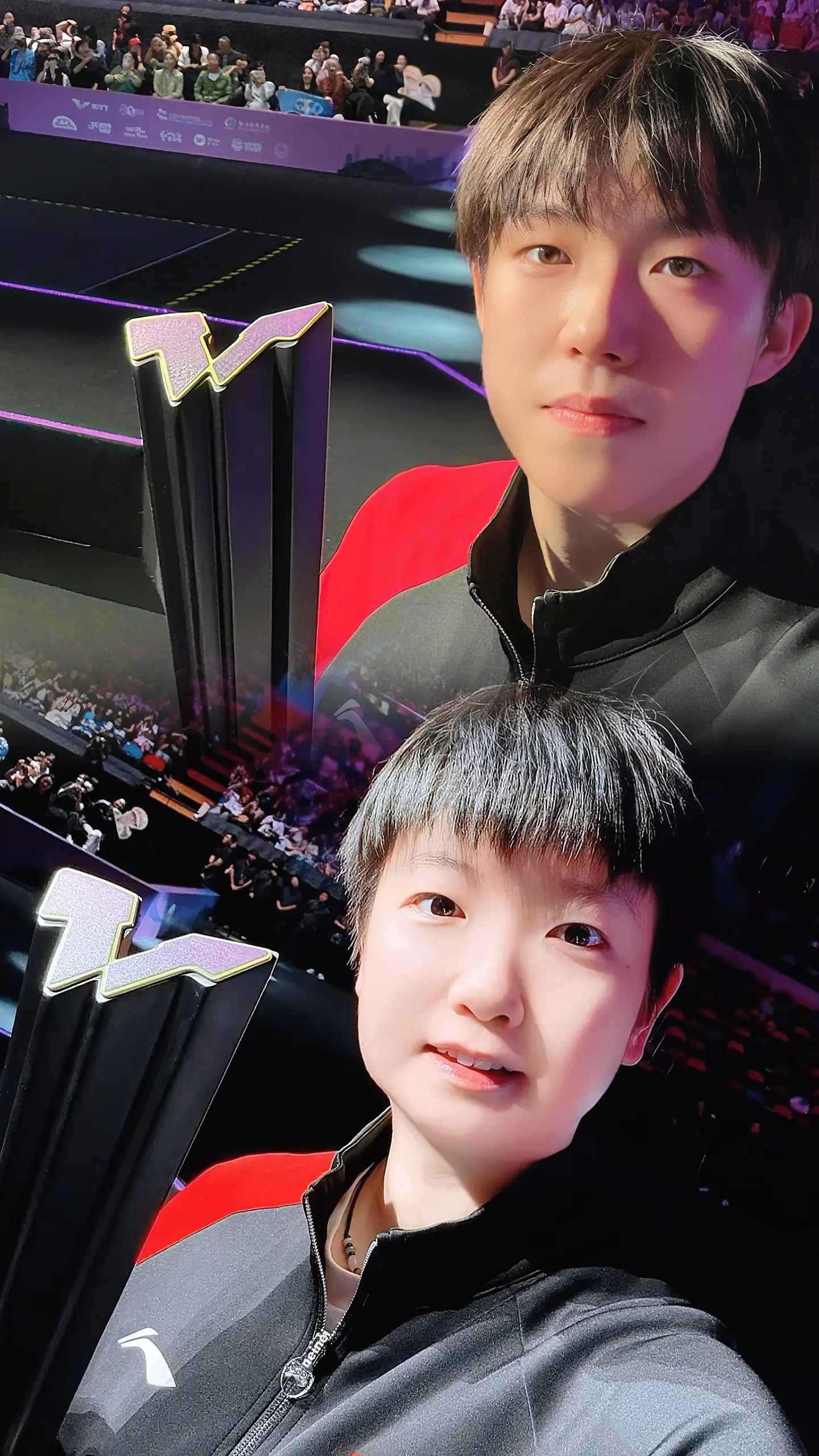 王楚钦还与专门前来现场观看自己比赛并特别给予支持的大明星任达华拍了合照,大头的跨界友谊,一直是这样的无匹。