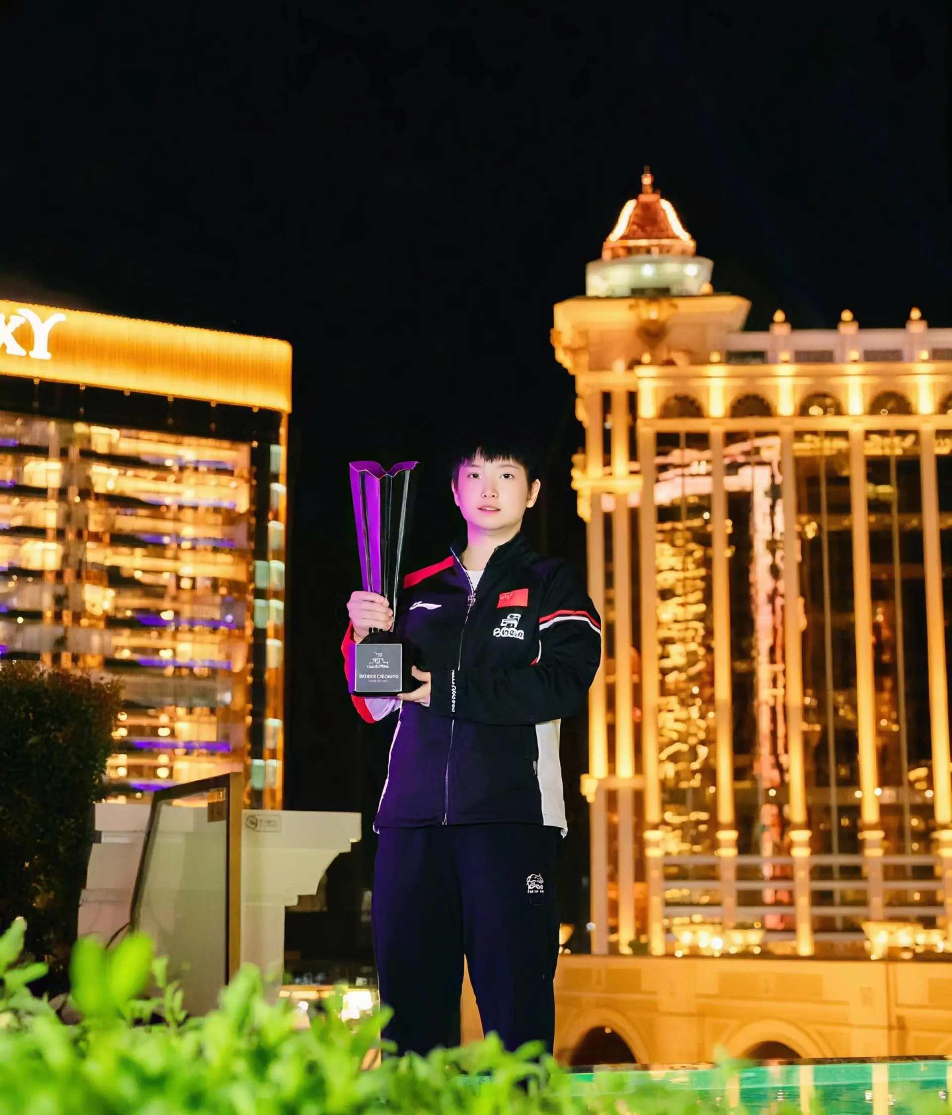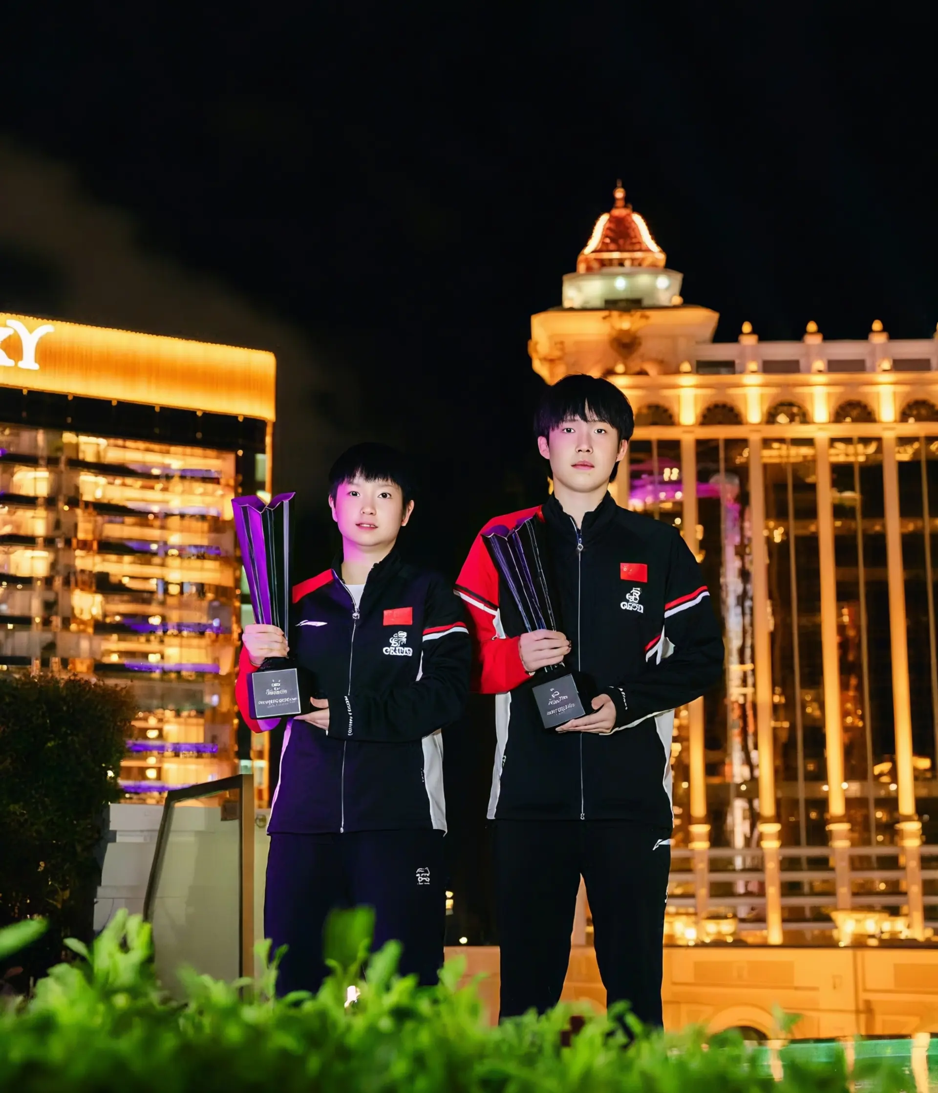 在颁奖礼结束后,其余人员都返回酒店休息,孙颖莎和王楚钦还在夜半时分前往澳门岗顶剧院和澳门银河莱佛士6/F户外泳池,拍摄了冠军城市宣传照。这也是WTT赛事的标准收尾动作。