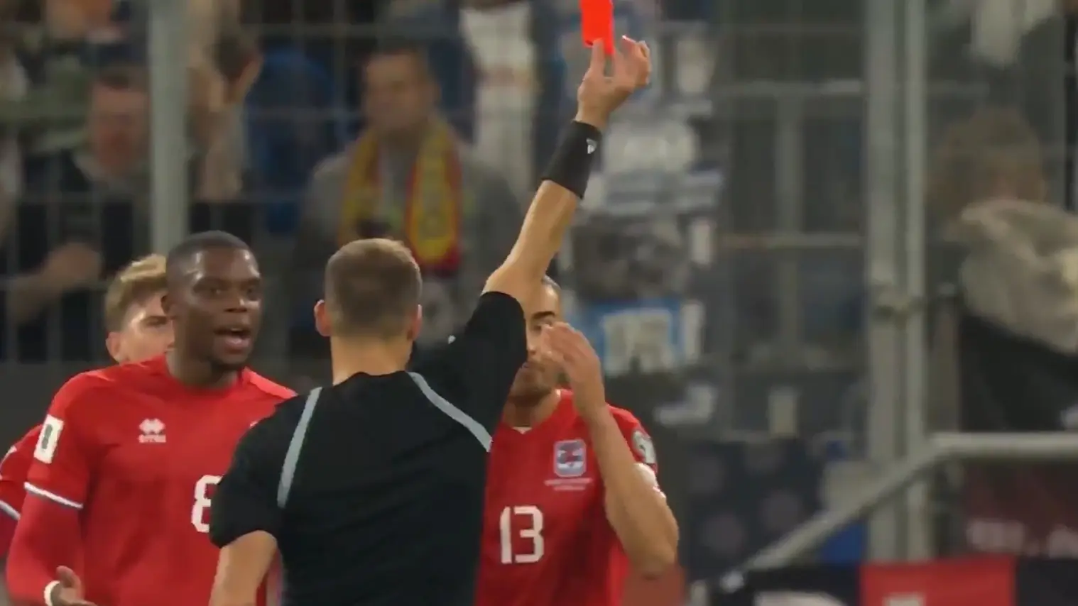 落后的卢森堡又收到坏消息,VAR突然介入,主裁观看回放,判定卡尔森禁区存在故意手球掀嫌疑,于是果断出示红点套餐,10打11,胜负悬念可以说已经没有悬念。第21分钟基米希稳稳罚进,这球还得归功于格纳布里,一切进展太顺利,他们可以踢得更为耐心,只是多打一人之后反而踢得有点“拘谨”,上半场比分停留在2-0。