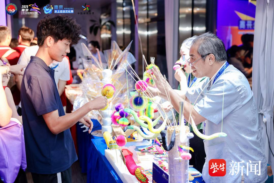 云锦展台前,来自英国剑桥大学的赛艇队员驻足良久,不时用手机记录细节。“这是我第一次见到南京云锦,” 他难掩兴奋,“每一根针线都像被赋予了生命,让我感受到对‘美’的极致追求。”金陵点翠传承人现场展示羽毛镶嵌技艺,转眼便为银饰缀上灵动光泽;南京泥人展台旁,憨态可掬的摆件引得学子们争相体验。