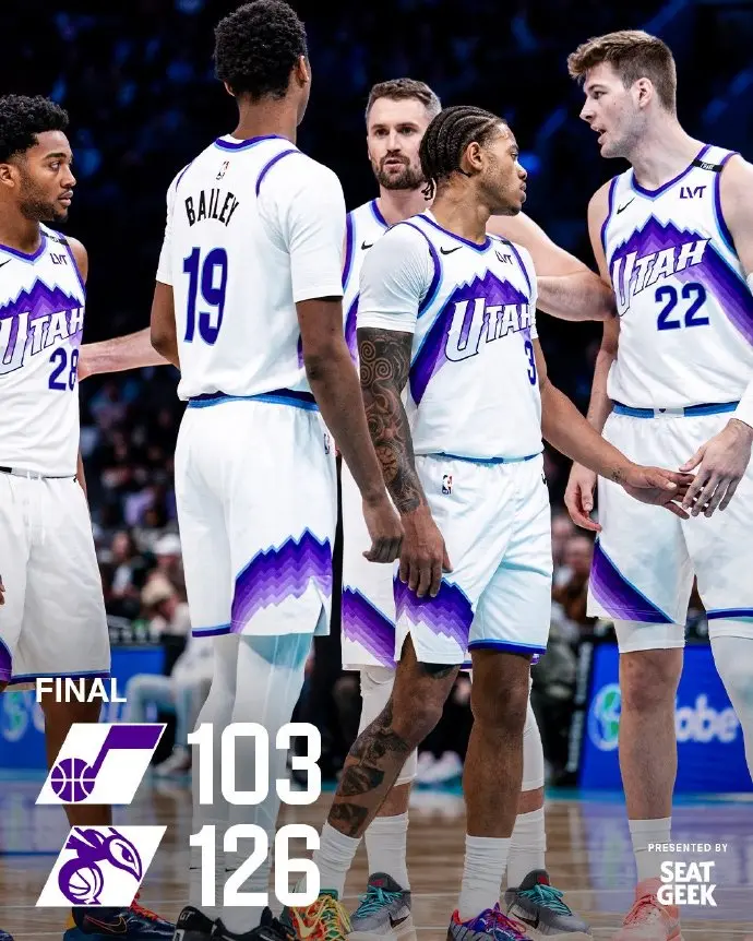 在三球缺阵的情况下,黄蜂今天在主场以126-103击败爵士,终结了3连败,也送给爵士3连败。从第一节比赛后半段开始,黄蜂就逐渐拉开分差,建立了两位数的领先优势,最多领先到解决29分,最终轻松战胜爵士,取得一场23分大胜。
