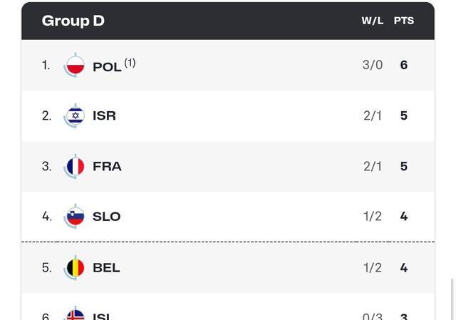D组的情况与c组大致一样,因为他们也是少赛一轮。目前波兰队三战全胜提前锁定16强,以色列和法国2胜1负,斯洛文尼亚亚和比利时1胜2负。今天晚上到明天凌晨将进行c组和d组的第4轮比赛。