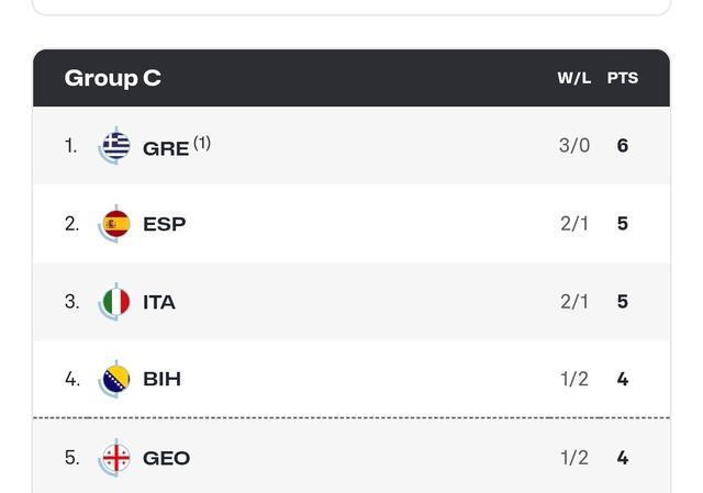 C组是目前最为混乱的一个小组,因为他们都还少赛一场,所以出现局势并不明朗。希腊队三战全胜已经提前晋级,西班牙、意大利同为2胜1负暂居二、三位,波黑队格鲁吉亚各自1胜2负,排名四、五位。