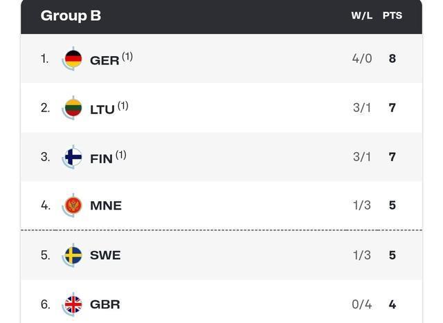 B组目前排名前3的德国、立陶宛和芬兰也都已锁定16强资格,黑山队将和瑞典队争夺最后一个16强资格。四战全胜的德国队,在b组明显的比其他队高出一筹。