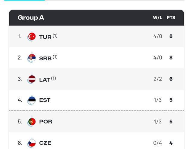 在最新的积分榜上,a组的前三名都已经提前晋级,土耳其和塞尔维亚各自四战全胜,土耳其凭借小分占据第一,最后一轮双方将正面交锋争夺小组第一。拉脱维亚虽然输了两场,但也锁定了16强资格。最后一个名额将在爱沙尼亚、葡萄牙之间产生。