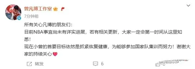 随后不久,曾凡博工作室辟谣,曾凡博冲击NBA的事情并无确定消息。而相关方面仍然在为曾凡博寻找机会去冲击NBA。