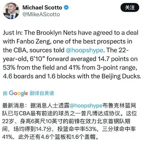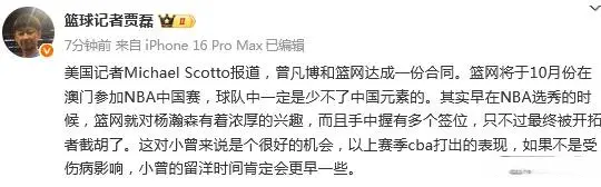此前,Ball Report记者Rob Murrows报道,多位消息人士透露,中国球员曾凡博将和篮网签下一份Exhibit-10合同。