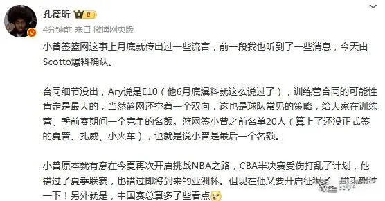 媒体人“孔德昕”发文点评:合同细节没出,Ary说是E10(他6月底爆料就这么说过了),训练营合同的可能性肯定是最大的,当然篮网还空着一个双向,这也是球队常见的策略,给大家在训练营、季前赛期间一个竞争的名额。篮网签小曾之前名单20人(算上了还没正式签的夏普、扎威、小火车),也就是说小曾是最后一个名额。