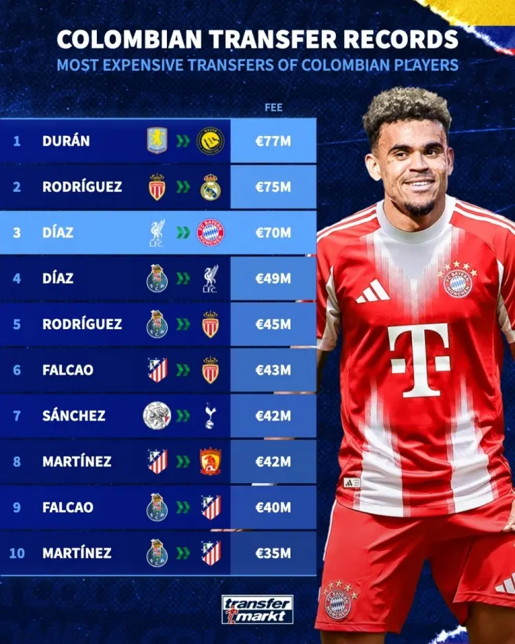 直播吧7月31日讯 拜仁以7000万欧固定+500万欧浮动的转会费从利物浦签下哥伦比亚边锋迪亚斯。德转统计了哥伦比亚球员转会纪录Top10,其中杜兰以7700万欧元居首,J罗7500万欧排名第二。