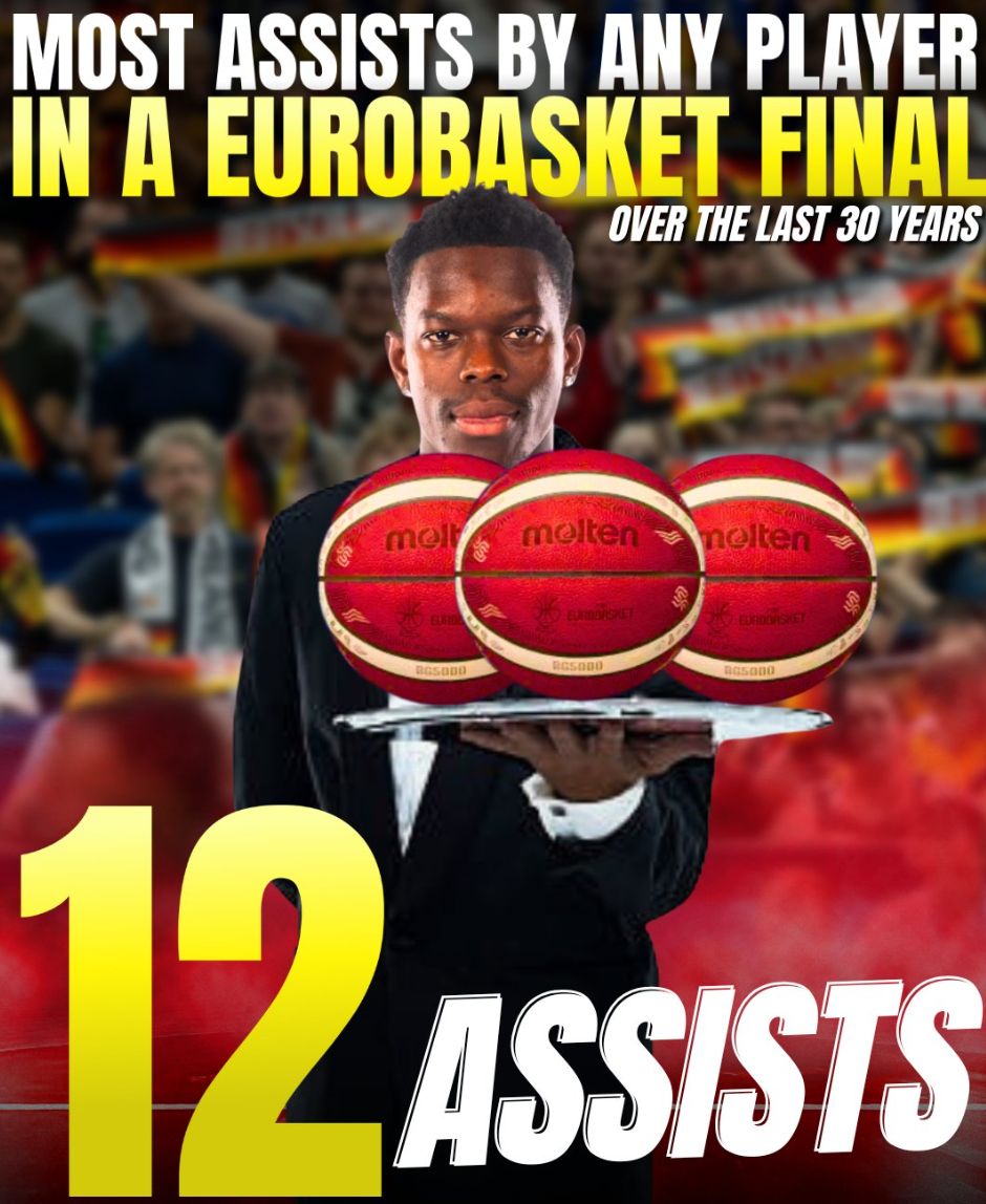 施罗德作为德国男篮核心,全场比赛34分钟,11中5,三分3中1,拿到16分12助攻1抢断6失误,他单场12次助攻也刷新欧洲杯决赛过去30年纪录。
