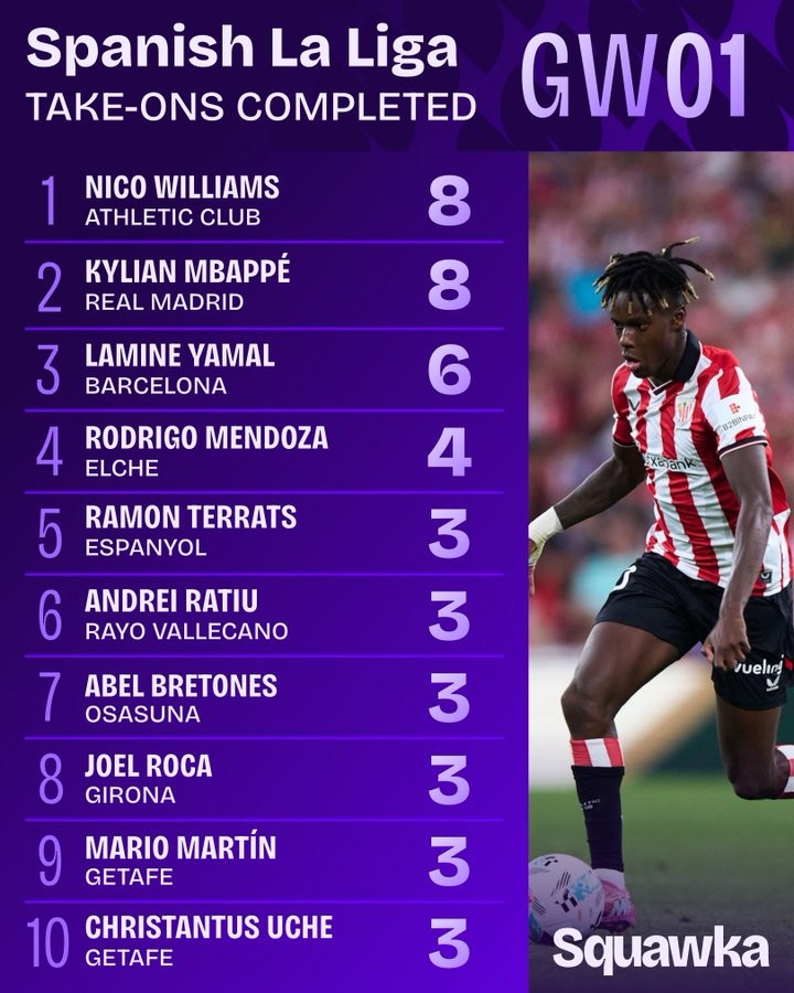 北京时间8月20日,知名数据平台Squawka列出了西甲首轮成功过人榜单。尼科-威廉斯和姆巴佩均8次成功过人分居第一、第二位。亚马尔6次成功过人排名第三。
