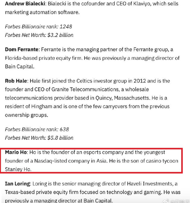 “亚洲赌王之子”何猷君也是凯尔特人的新股东之一。何猷君曾在波士顿留学多年,他曾表示刚到美国就喜欢上凯尔特人,而杰伦-布朗是他最喜欢的球星。