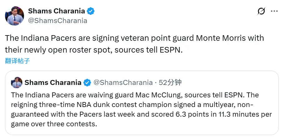 北京时间11月7日,据名记Shams报道,步行者队将裁掉麦克朗,并签下蒙特-莫里斯。步行者队记Dopirak透露,莫里斯将签下一份为期一年的非保障合同。