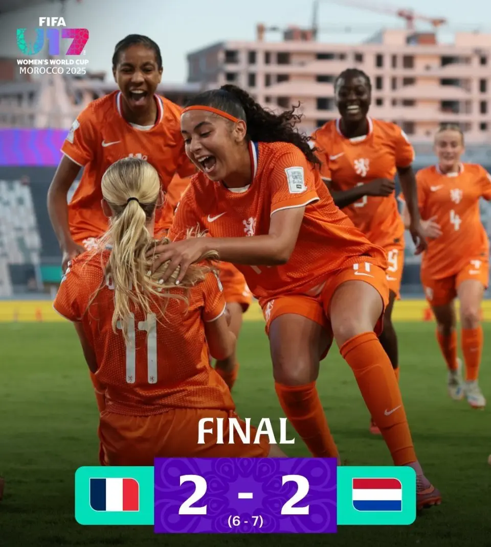 继上1/8决赛点球大战淘汰上届季军美国队后,荷兰女足又在1/4决赛补时阶段仍0-2落后的情况下,连进2球绝平另外一支夺冠热门法国队,随后的点球大战,荷兰队总比分7-6胜出,首次参加U17世界杯便爆冷杀进半决赛。