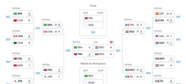 最终,朝鲜2-0淘汰巴西,成功晋级决赛,也是队史首次连续两届打进决赛,上一届击败西班牙拿下冠军。