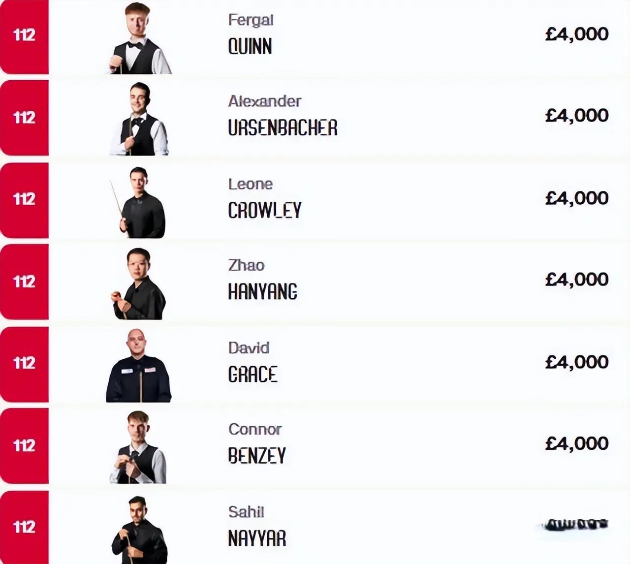 本次斯诺克西安大奖赛资格赛,麦克吉尔的对手是大卫格雷斯,在世台联官网,大卫格雷斯仅以4000英镑的奖金积分排在并列第112位,在整个125位有排名的职业斯诺克选手当中处于末尾的位置,对阵这样一位选手,即便麦克吉尔近年来成绩不佳,赛前也是被普遍看好能够顺利过关的,然而在比赛开始之后,麦克吉尔却给自己挖下大坑,直接连输四局以总局分0-4大幅落后,在这场9局5胜制比赛中面临对手大卫格雷斯的满赛点。