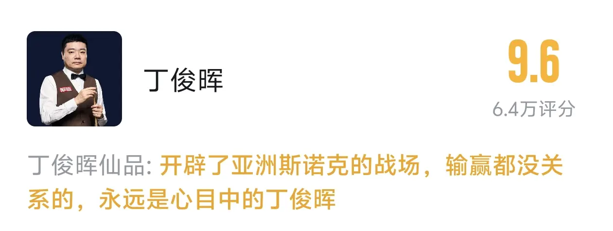 本场焦点战,有20多万虎牙用户给赵心童和丁俊晖打出了9.7和9.6的超高分,并为选手加油助威,新旧交替的巅峰对决展示了中国斯诺克最动人的传承与希望。