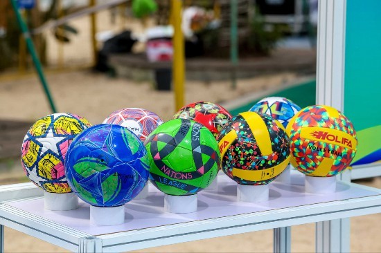 涵达体育展位上,五花八门的足球、排球、篮球,摆放得整整齐齐。“大球”玩家为何忽然打起了“小球”的主意?