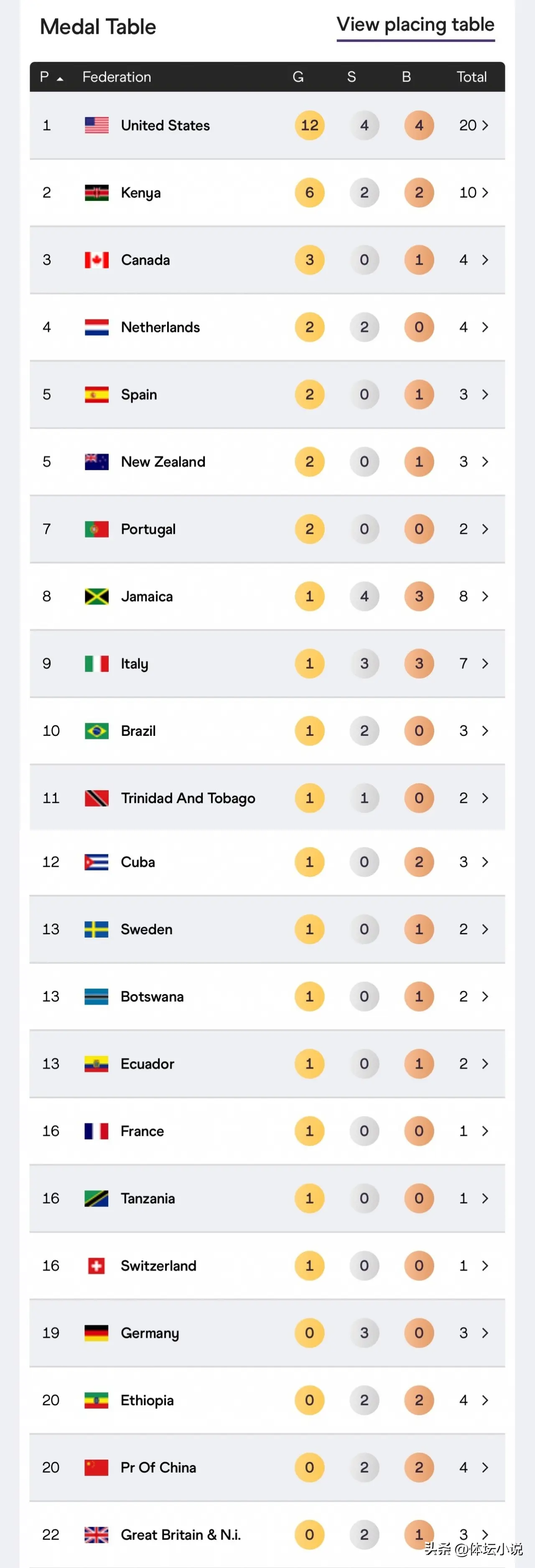 本届世锦赛第八个比赛日已经结束,8个比赛日产生了40金,被18个国家摘走,金牌上双的仅有美国一队,金牌在5枚以上的仅有美国和肯尼亚。金牌在2枚以上的是7队,那就是美国,肯尼亚,加拿大,荷兰,西班牙,新西兰,葡萄牙!