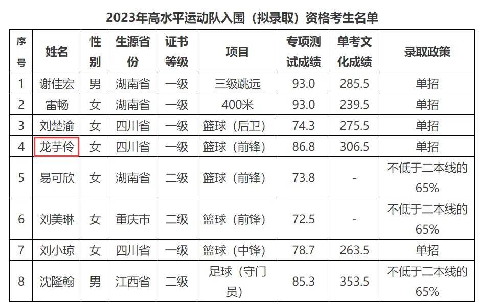 2023年龙芋伶以专项成绩86.8分,文化成绩306.5分单招进入了武汉科技大学,如果龙芋伶的文化成绩再好一些她肯定能进入985/211而不是武汉科大这样的双非院校。