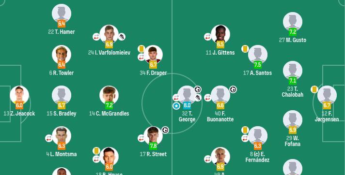 切尔西首发:12-约根森、27-古斯托、29-福法纳、23-查洛巴、21-哈托、17-桑托斯、8-恩佐(70'3-库库雷利亚)、49-加纳乔(59'41-埃斯特旺)、40-博纳诺特(95'46-雷吉·沃尔什)、11-吉滕斯(70'7-内托)、32-乔治(70'62-舒迈拉-穆赫卡)