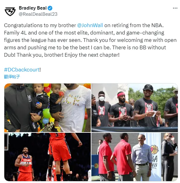 比尔晒照并且写道:祝贺我的兄弟约翰-沃尔从NBA退役。永远是一家人,你是联盟史上最顶尖、最具统治力、最具改变比赛影响力的人物之一。感谢你当初张开双臂欢迎我,并鞭策我做到最好。没有Dub就没有篮球!谢谢你,兄弟!祝你享受人生的下一个篇章!
