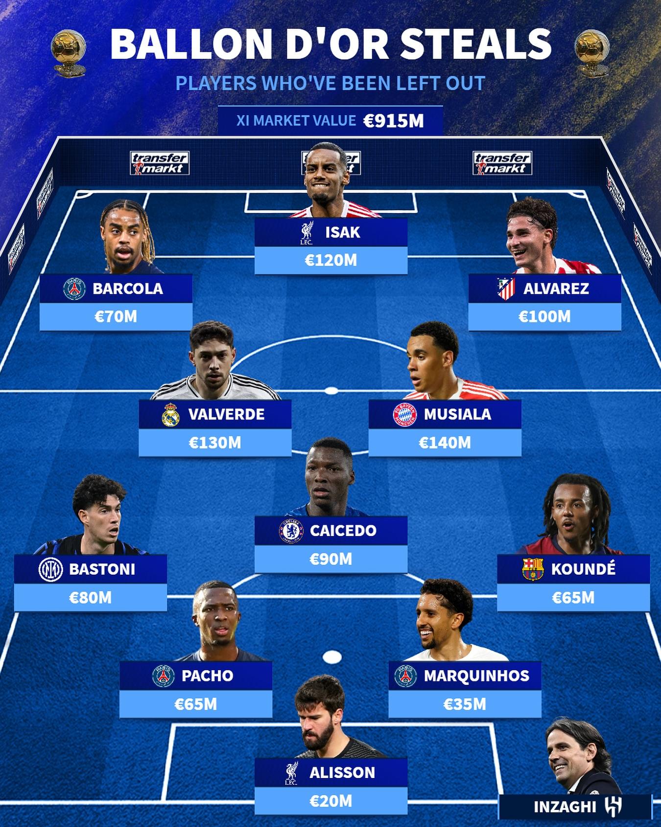 虎扑09月23日讯 德国转会市场盘点了落选本届金球奖提名的球星,并组成了一套最佳阵容。