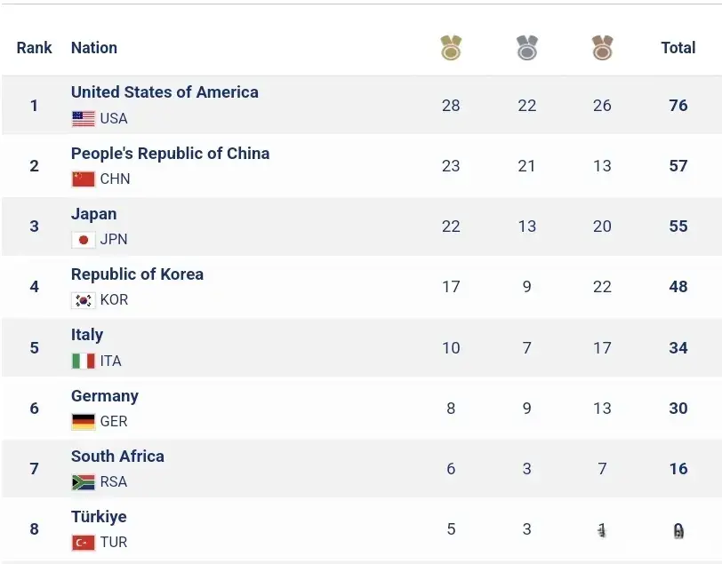 北京时间2025年7月26日,2025世界大学生运动将继续展开最后一个比赛日得争夺,目前的最新奖牌榜上美国大学生代表团依旧是第1位,美国的奖牌数为28金22银26铜,总奖牌数76枚,根据德国大运会的赛程安排,闭幕式将于北京时间2025年7月27日举行,因此美国大学生代表团奖牌榜第1的位置基本已经锁定。