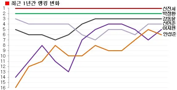 右侧从高到低依次:申真谞,朴廷桓,姜东润,申旻埈,李志贤,安成浚,排名第8的卞相壹未列其中。