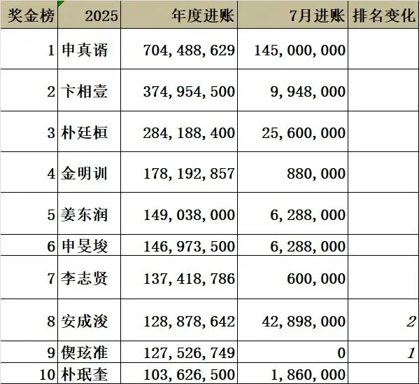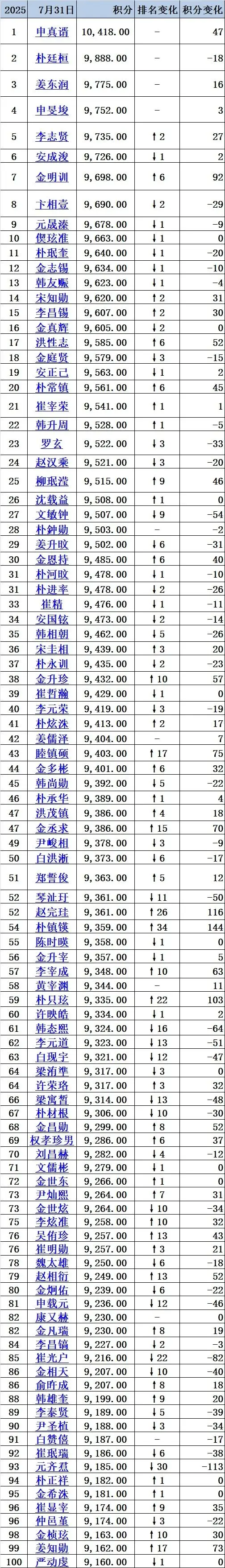 根据韩国棋院5日公布的2025年8月职业棋手排名,申真谞九段以10,418分稳居榜首。在刚计入的7月赛事中取得7胜,斩获47个积分,并在Hana银行围棋超级对抗赛与GS加德士杯职业赛事中双双夺魁。