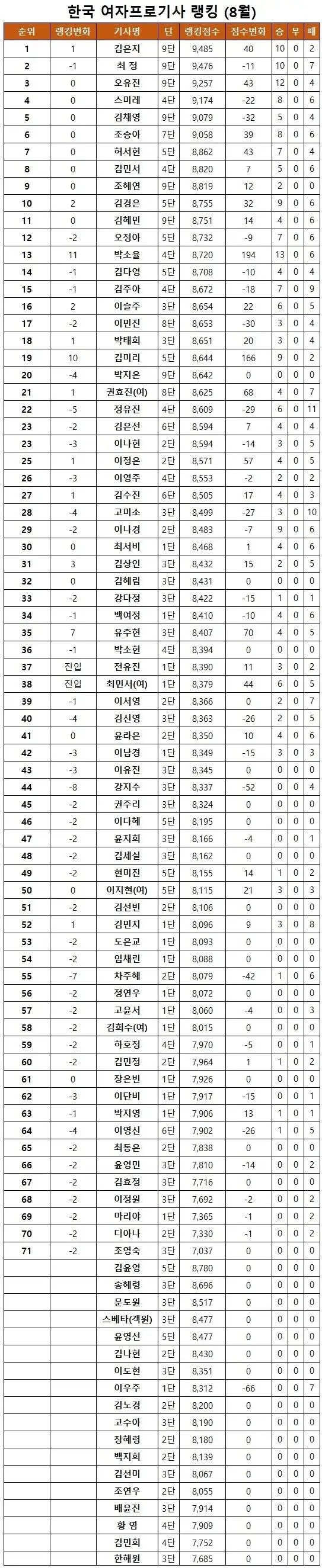女子3-9名位次维持不变,金京垠四段上升两位重返前十。综合排名方面:金恩持位列30(较上月+3),崔精33(-5),吴侑珍76,仲邑堇96,金彩瑛116,曹承亚124。