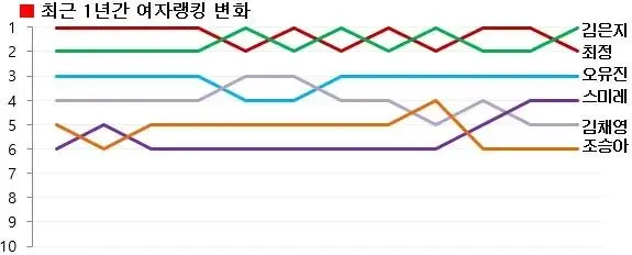 绿=金恩持,红=崔精,灰=金彩瑛,蓝=吴侑珍,桔=曹承亚,紫=仲邑堇。