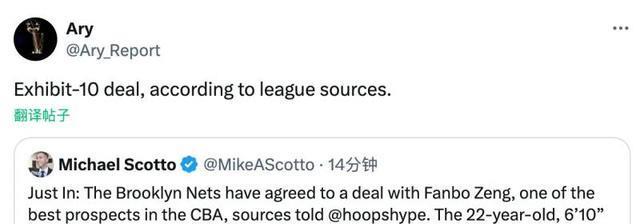 曾凡博工作室官宣了曾凡博和篮网签约的消息后,不少球迷都纷纷猜测该合同的性质。随后记者Ary表示,他的消息源透露,双方签订的是一份Exhibit-10合同。