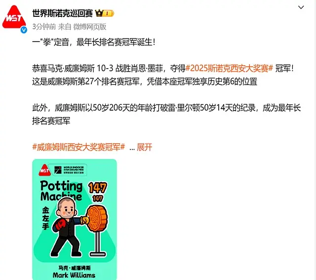 在这个激动人心的夜晚,马克·威廉姆斯以10-3的压倒性比分战胜肖恩·墨菲,捧起了西安大奖赛的冠军奖杯。