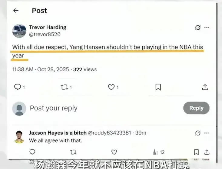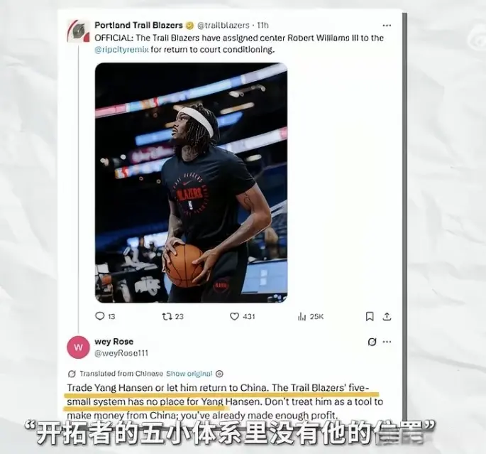 另一位美国球迷发博表示:“要么让他回中国去,要么交易杨瀚森,开拓者的五小体系里,就没有他的位置,别把他当成从中国赚钱的工具,你们已经赚得不少了。”