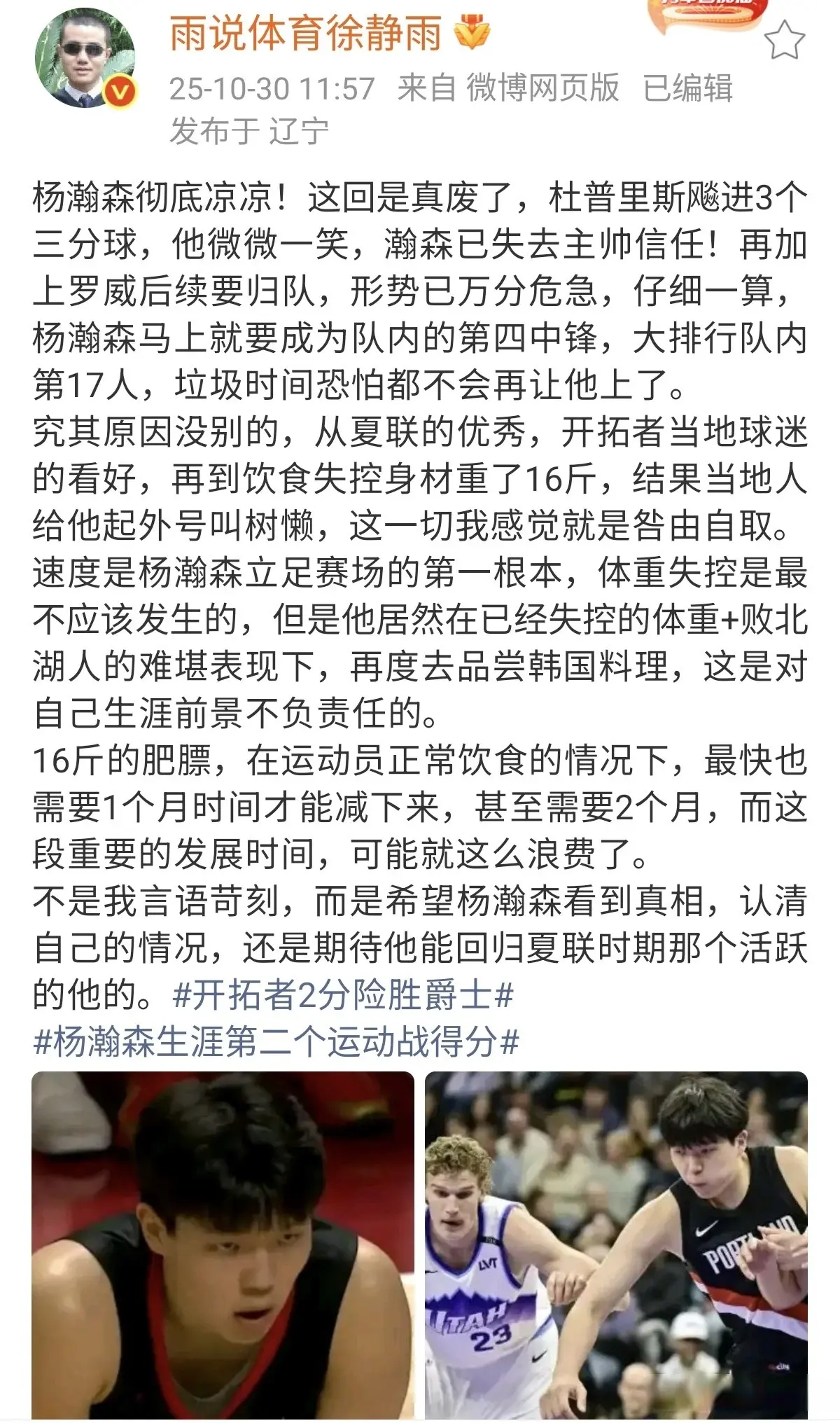 当篮球评论员徐静雨看到这种表现之后,他评论道:“杨瀚森彻底凉凉!这回是真废了,杜普里斯进3个三分球,他微微一笑,瀚森已失去主帅信任!再加上罗威后续要归队,形势已万分危急,仔细一算, 杨瀚森马上就要成为队内的第四中锋,大排行队内第17人,垃圾时间恐怕都不会再让他上了。”
