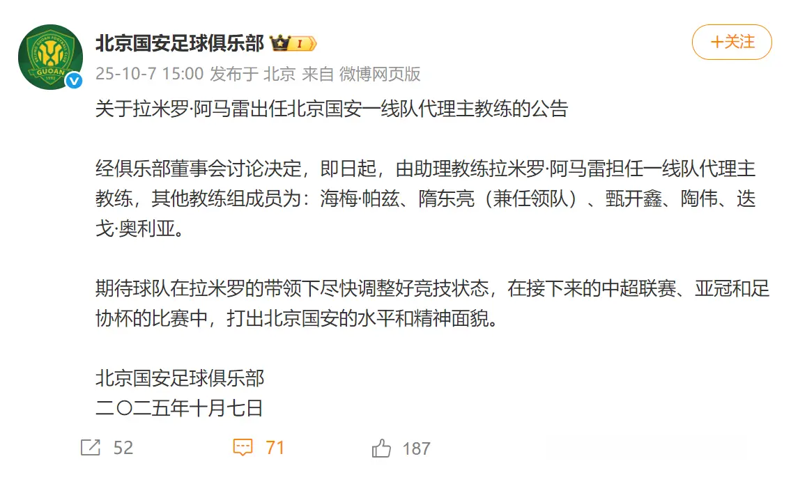 7日15点,北京国安再次官宣,原塞蒂恩助理教练拉米罗·阿马雷将担任一线队代理主教练。此前传闻陶伟、隋东亮有望担任代理主教练,然而俱乐部并没有这样选择,而是选择了拉米罗·阿马雷。拉米罗·阿马雷背景不一般,拉米罗19岁后转型为沙滩足球运动员。2次获得沙滩足球世界杯MVP,5次获得沙滩足球欧洲联赛冠军。退役后曾执教巴塞罗那沙滩足球队、中国沙滩足球队等。