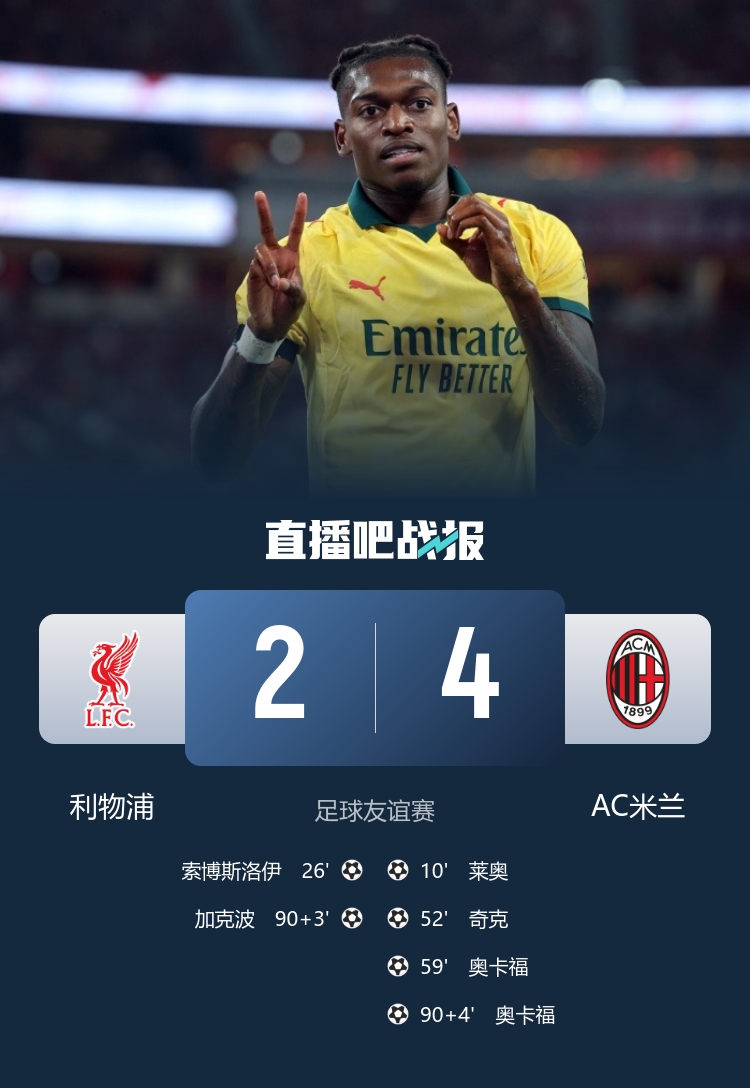 直播吧7月26日讯 北京时间7月26日19:30,利物浦与AC米兰在启德体育场进行季前友谊赛。上半场,普利西奇助攻莱奥破门,莱奥进球后致敬若塔,索博斯洛伊十分角吊射扳平;下半场,莱奥助攻奇克破门,萨勒马科尔斯助攻奥卡福再入一球,加克波补时破门。最终,利物浦2-4不敌米兰。