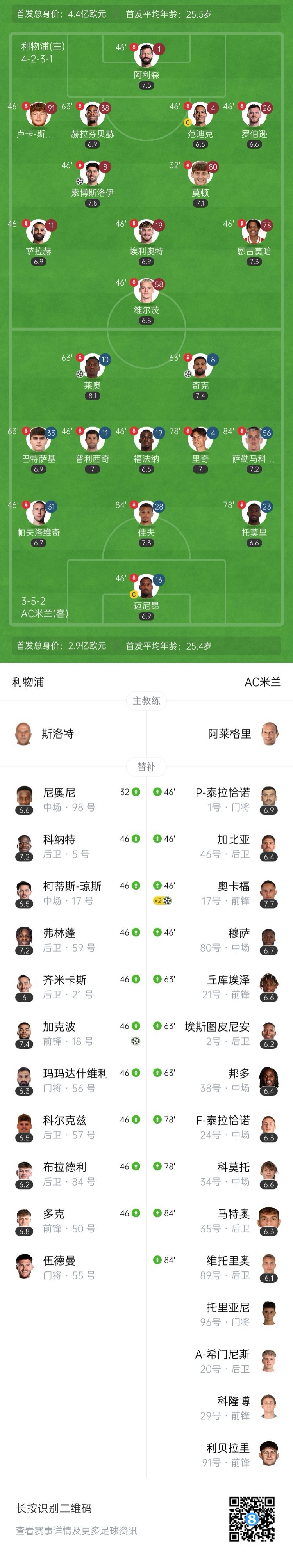 全场比赛结束,利物浦2-4不敌米兰。