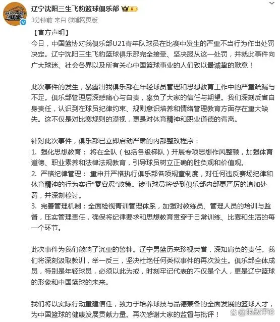 辽宁男篮官方发文回应此次的事件表示:针对此次事件,俱乐部已立即启动严肃的内部整改程序: