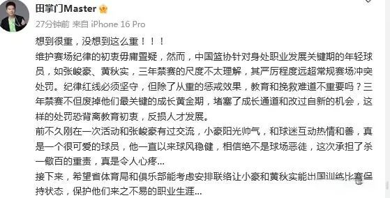“维护赛场纪律的初衷毋庸置疑,然而,中国篮协针对身处职业发展关键期的年轻球员,如张峻豪、黄秋实,三年禁赛的尺度不太理解,其严厉程度远超常规赛场冲突处罚。纪律红线必须坚守,但除了从重的惩戒效果,教育和挽救难道不重要吗?三年禁赛不但废掉他们最关键的成长黄金期,堵塞了成长通道和改过自新的机会,这样的处罚恐背离教育初衷,反损人才发展。