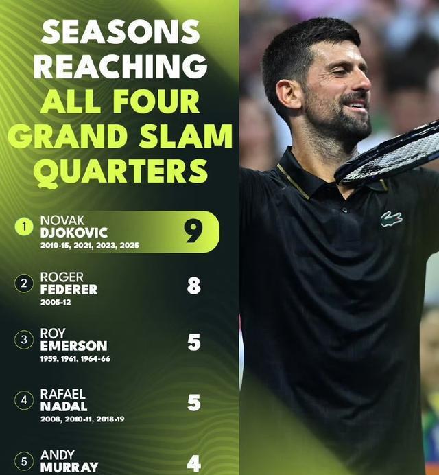 悄然之间,又一历史纪录被德约科维奇改写。在单赛季全部打入四大满贯八强次数排名上,德约科维奇以9次独占鳌头,超越了费德勒的8次。纳达尔以5次,与远古时期的埃莫森并列第三,穆雷4次紧随其后。