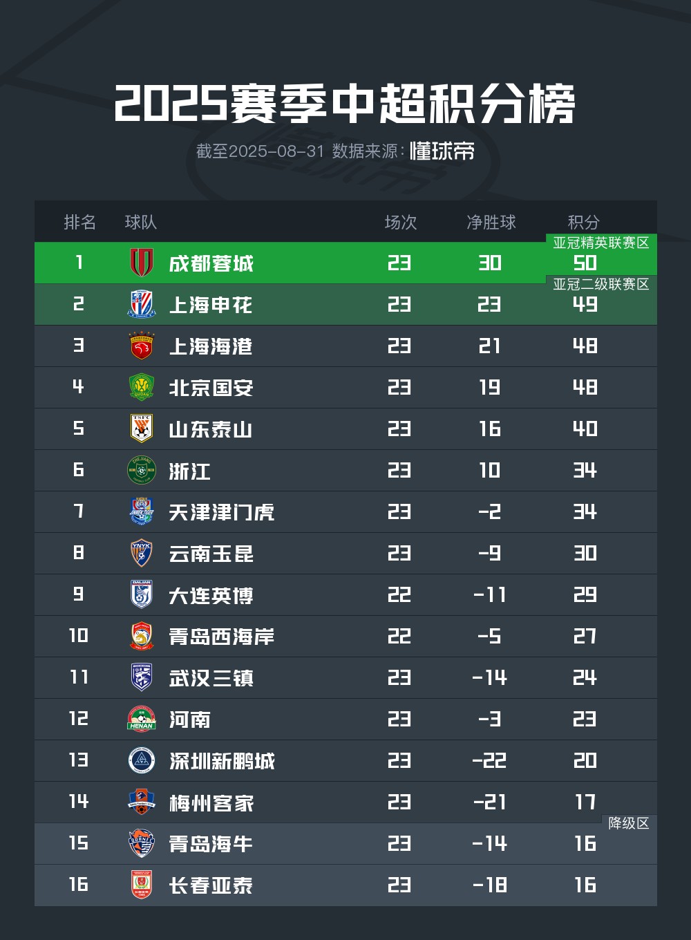 北京时间8月31日,中超第23轮除推迟的英博vs西海岸外其余7场已经全部结束。