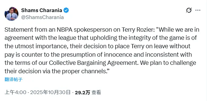 球员工会的一位发言人表示:“尽管我们与联盟一致认为维护比赛公正性至关重要,但他们让特里停薪的决定,既违背了无罪推定原则,也与劳资协议的条款不符。我们计划通过正当渠道对这一决定提出异议。”